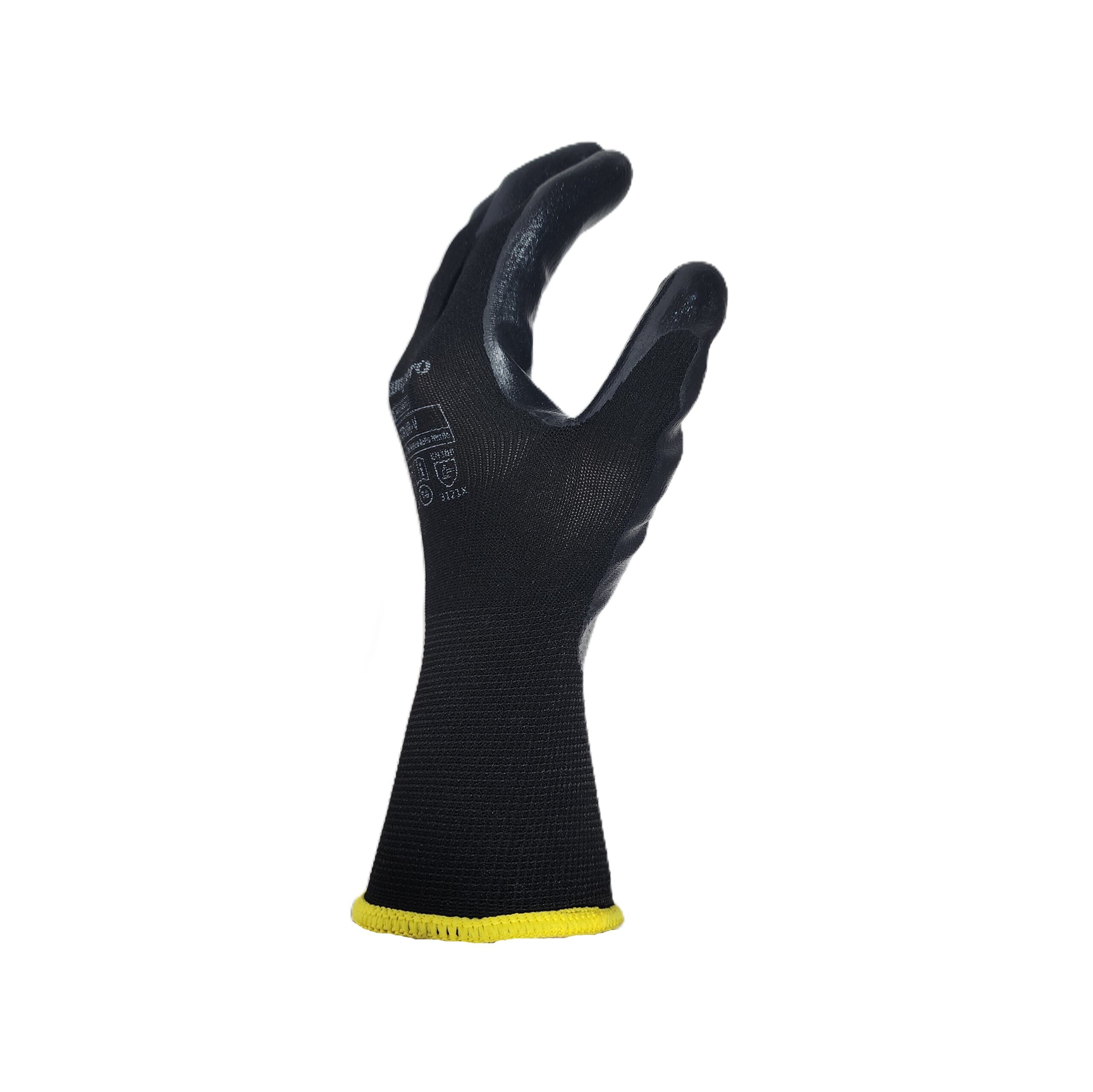 - Guante con revestimiento de nitrilo liso en la palma y forro de tejido de poliéster de calibre 13.