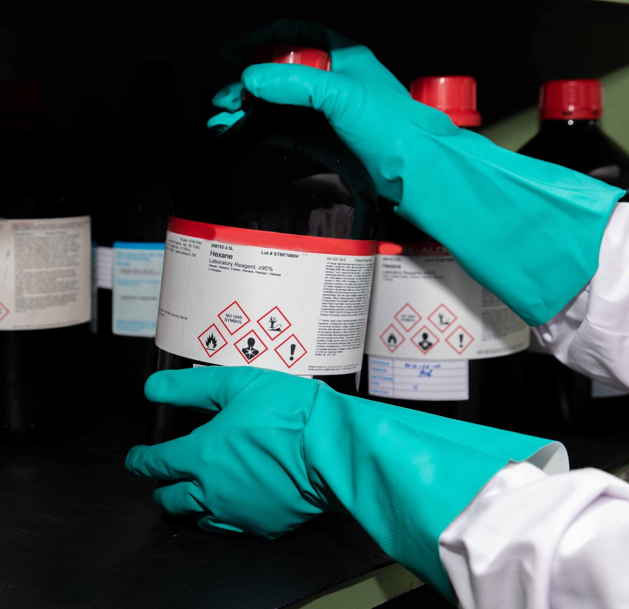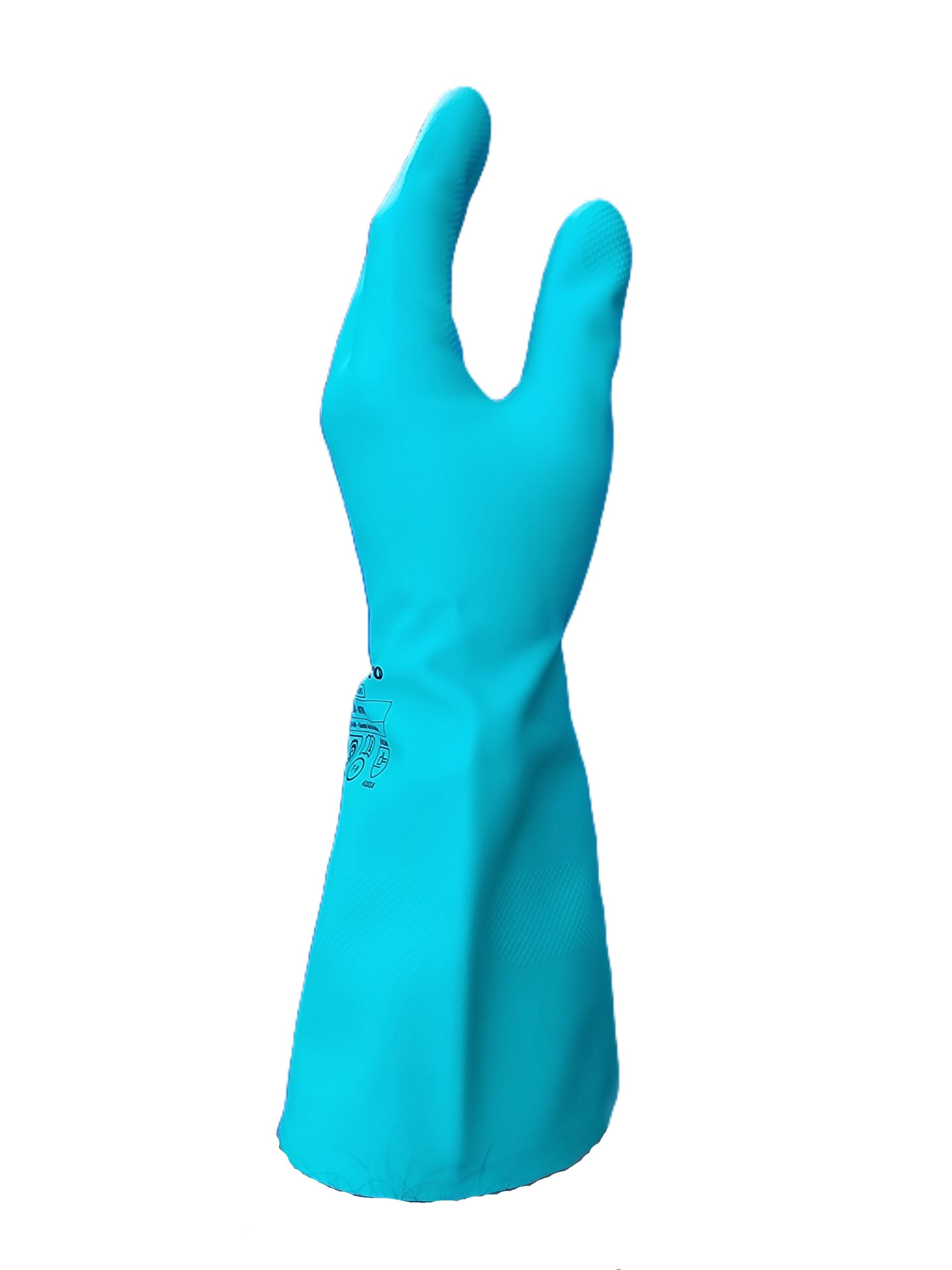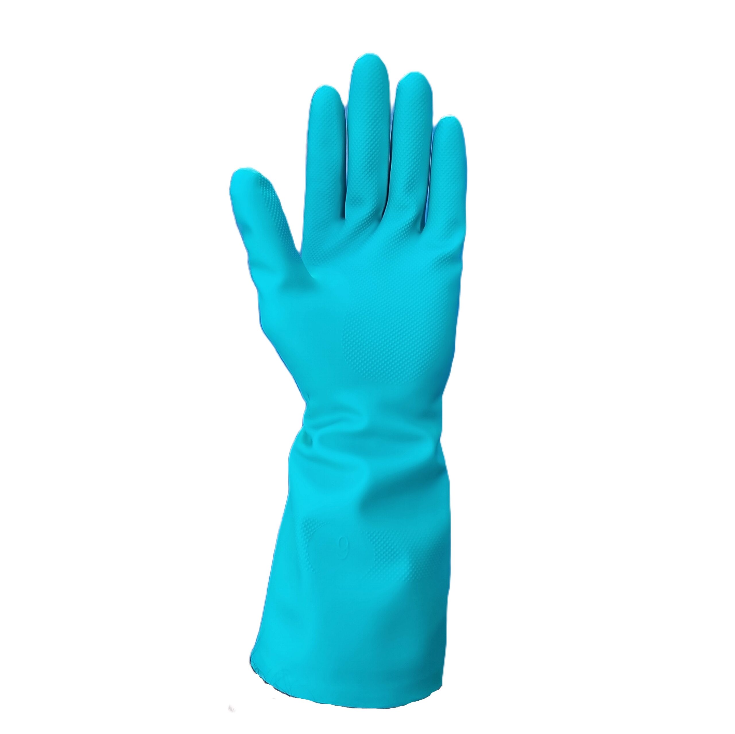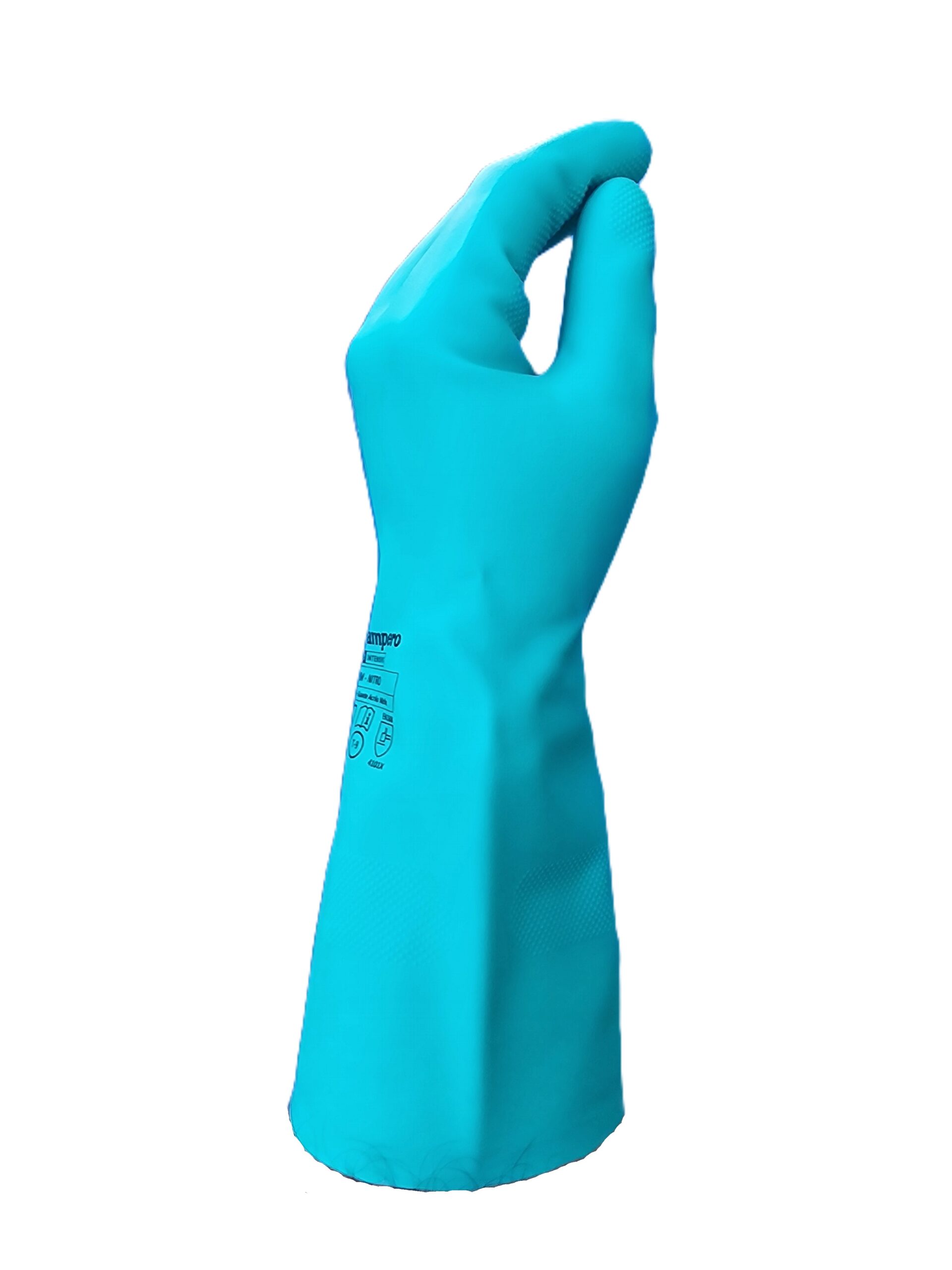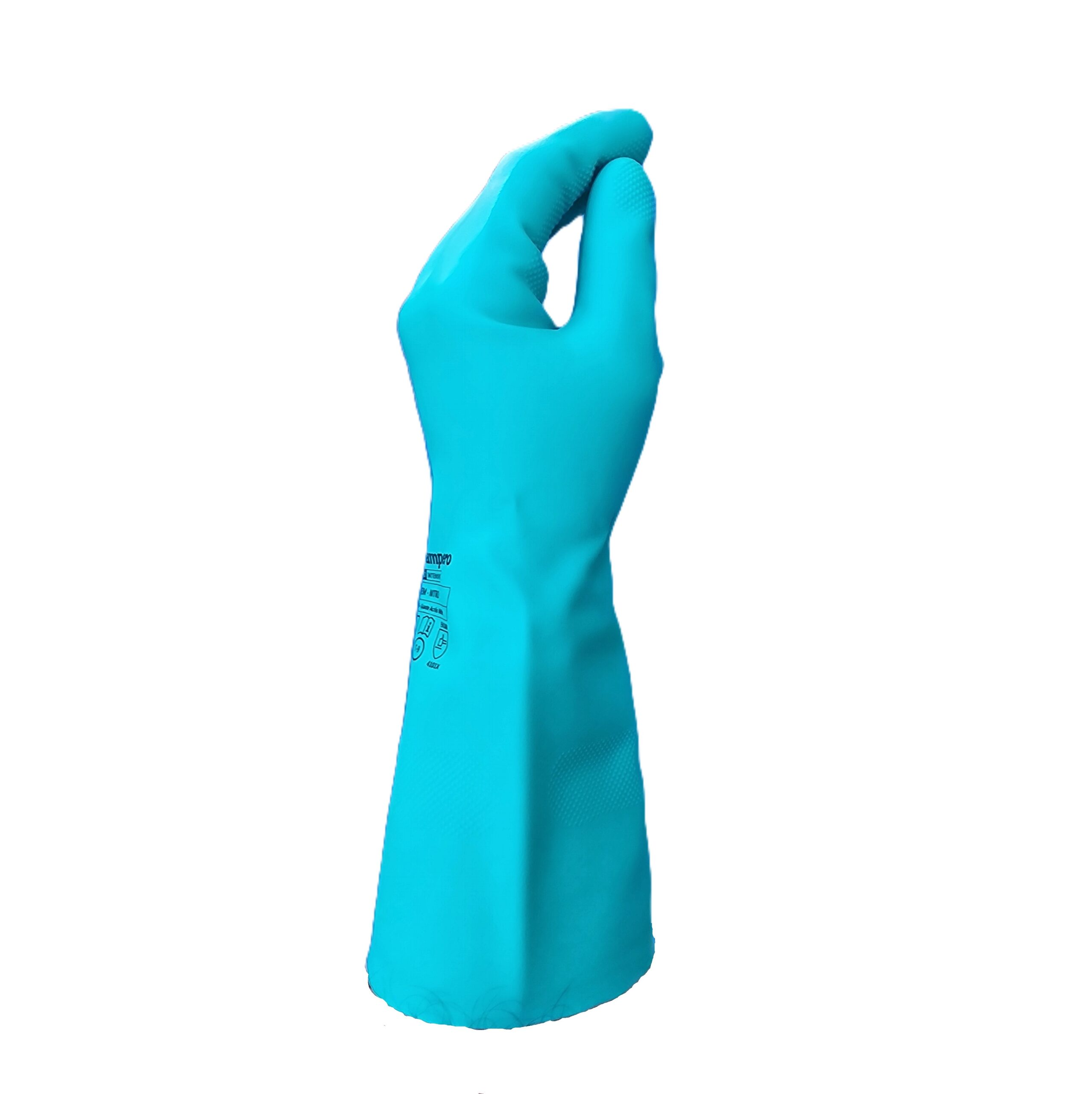 - Guante de nitrilo de color verde, impermeable y resistente a productos químicos.
